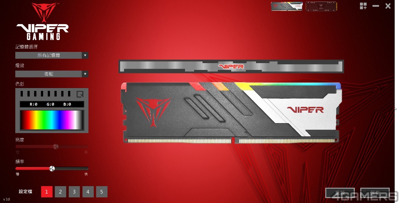 玩家可透過博帝開發的 VIPER RGB 3.0 軟體,設定包括自家 RGB SSD 與記憶體的燈光效果。如開機自動啟用自訂燈光、從多種預設燈效中選擇喜歡的效果、自訂頻率速度或亮度等,也可以儲存最多五組自定義燈光效果設定檔。自行設計個人風格的 RGB 燈效。