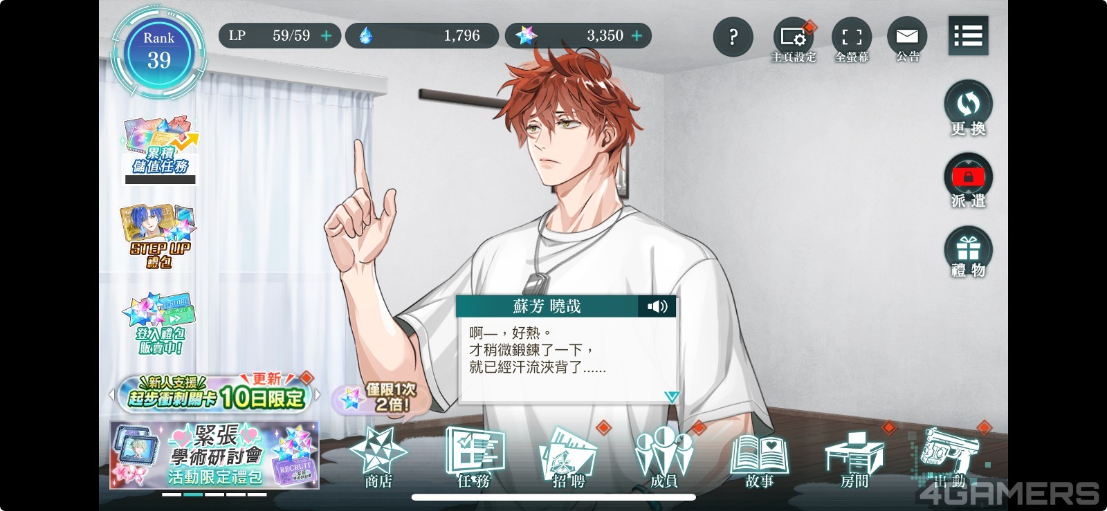 遊戲中大致上可分為兩種類型的養成玩法,第一是與主線戰鬥息息相關的「出動」;第二則是可以與角色們交流的「房間」,在房間中可以看到角色們私下的樣貌喔!