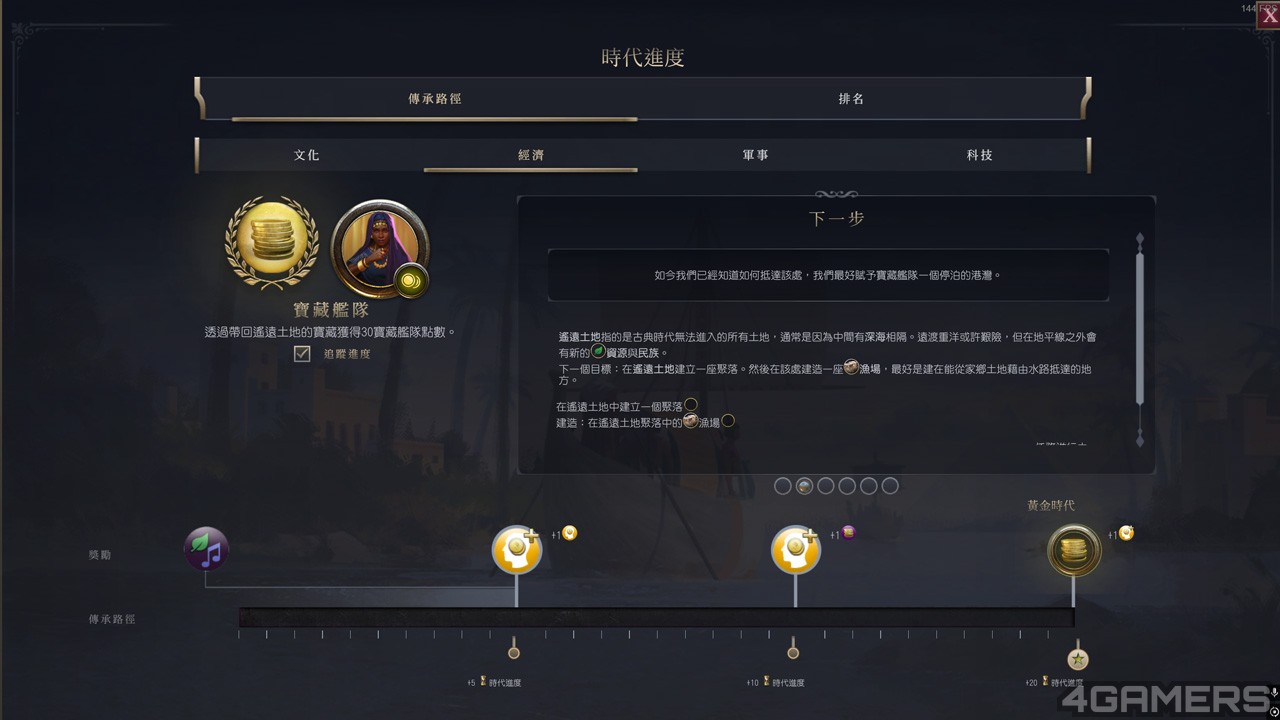 傳承路徑在文明 7 來說也有很大的變化,傳承路徑有 4 種,分別是文化、軍事、科技與經濟,而在不同時代,傳承路徑也會有不同的任務,畢竟時代之間有著幾百年的間隔。