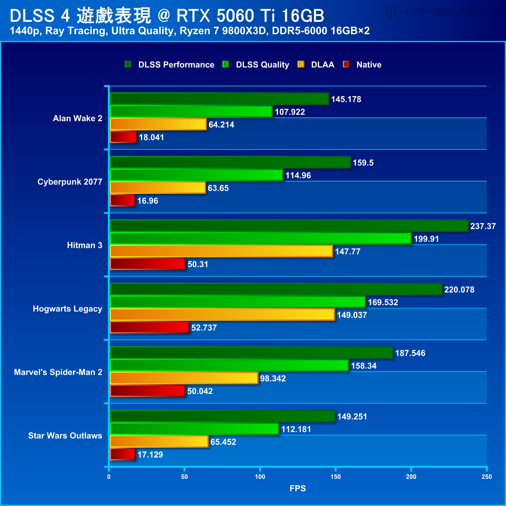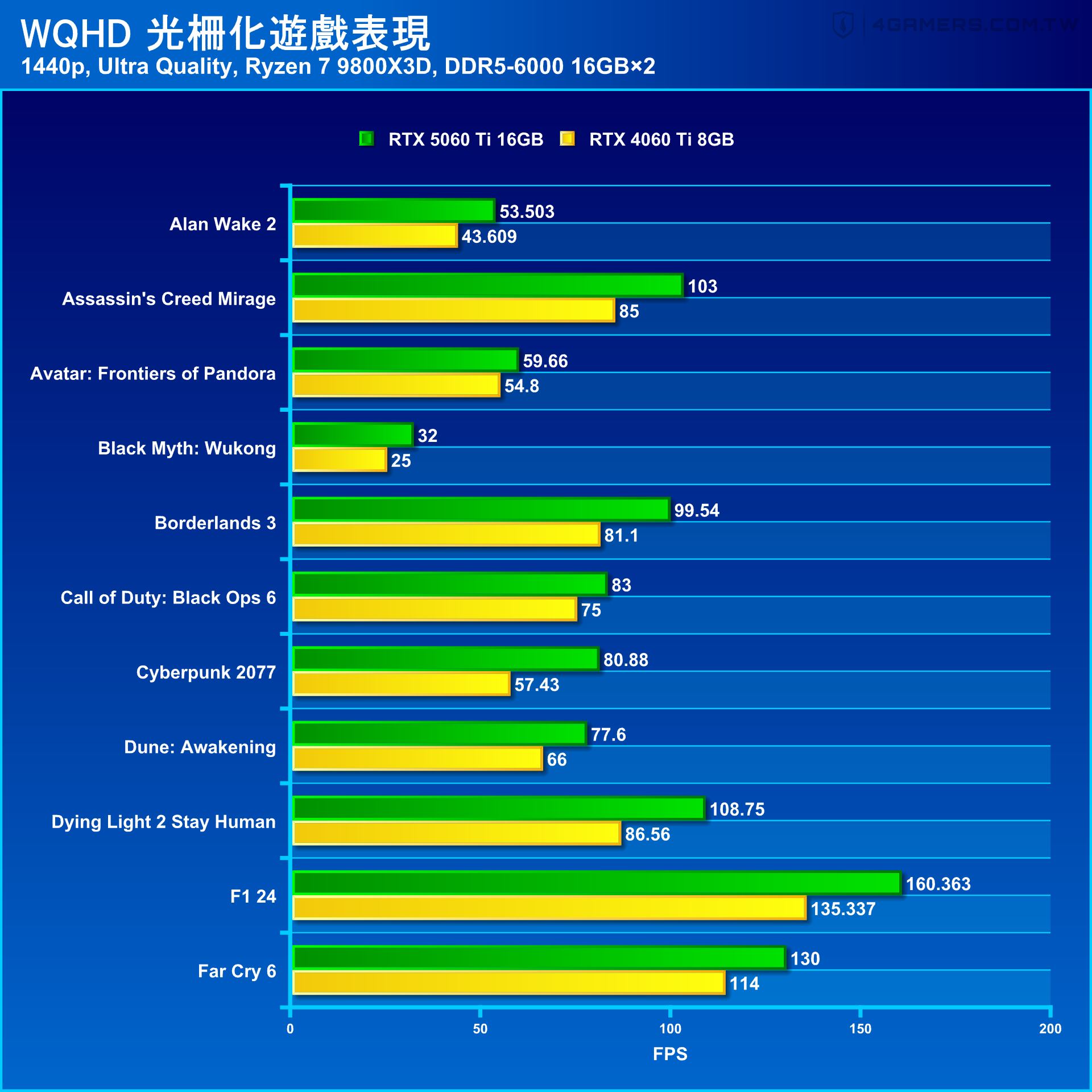 不套用光線追蹤的 21 款 AAA 遊戲實測中,RTX 5060 Ti 運行 WQHD 1440p 解析度的平均畫面流暢度約 96.5 fps,較 RTX 4060 Ti 成長 21.5%,提升幅度最明顯的是《電馭叛客 2077》(Cyberpunk 2077)近 41%。