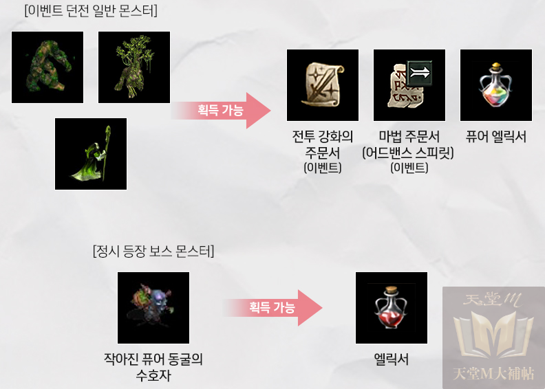 台版曾有類似活動,除了打怪完成任務數量可獲得 100 片葉子獎勵外,內部怪物都有機會掉落戰鬥卷、靈魂昇華卷以及純白萬能藥,而每一段時間會出現純白洞穴守護者(外觀為優卡)擊殺之後有機會直接獲得1瓶萬能藥。