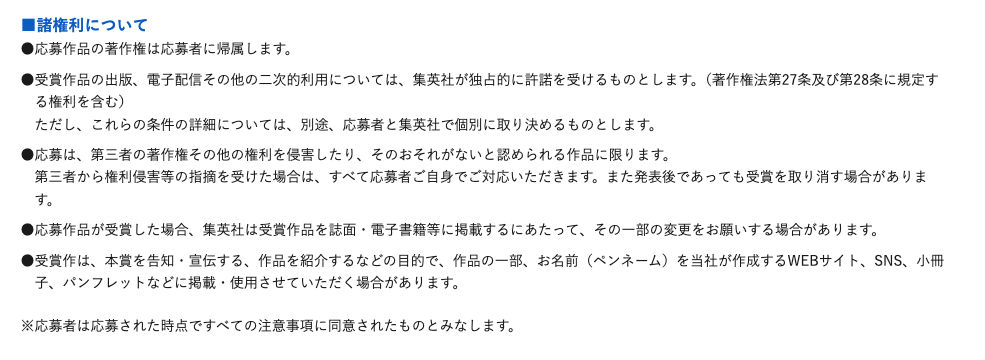 回顧 Young Jump 新人漫畫大賞的參加規章,其中一項為「投稿作品須確認不侵害第三方著作權及其他權利。若接獲第三方指控權利侵害,應由投稿者自行處理,即使作品已獲選,仍可能撤銷獲獎資格」,沒有特別講明不得使用 AI 生成圖片。