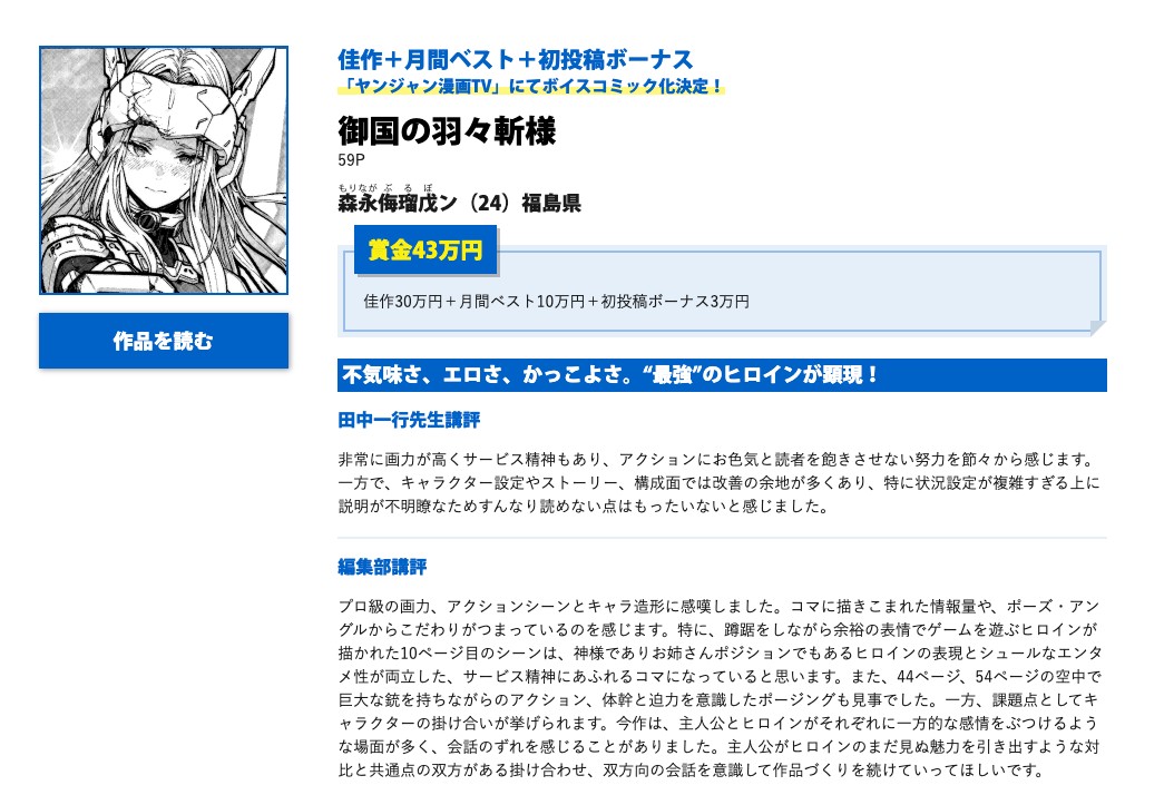 集英社 Young Jump 第 36 屆新人漫畫大賞於 9 月 18 日公開得獎結果,其中獲頒佳作的作品為《御国の羽々斬様》(作者:森永侮瑠戊ン),該得主獲得了 43 萬日圓(約新台幣 8.6 萬元)獎金,近期更推出由聲優村上奈津實、内田秀所聲演的有聲漫畫影片。